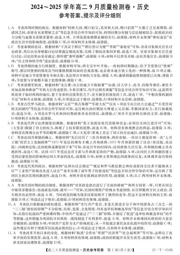山西省吕梁市部分学校2024-2025高二上学期9月考试历史答案