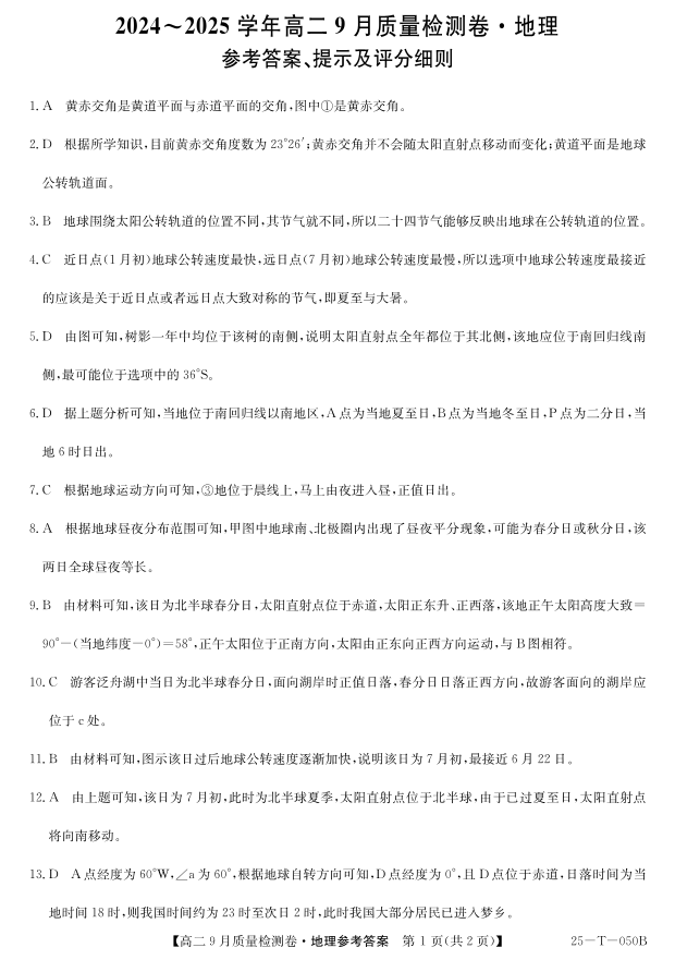 山西省吕梁市部分学校2024-2025高二上学期9月考试地理答案