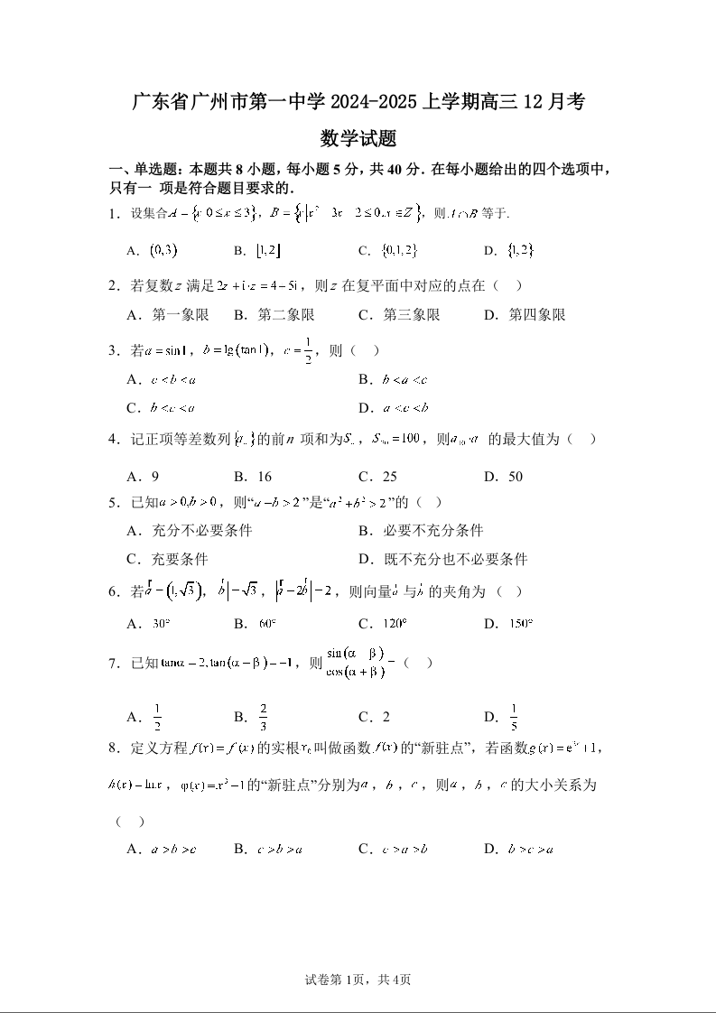 【广东卷】百强校丨广东省广州市第一中学2025届上学期12月考数学+答案