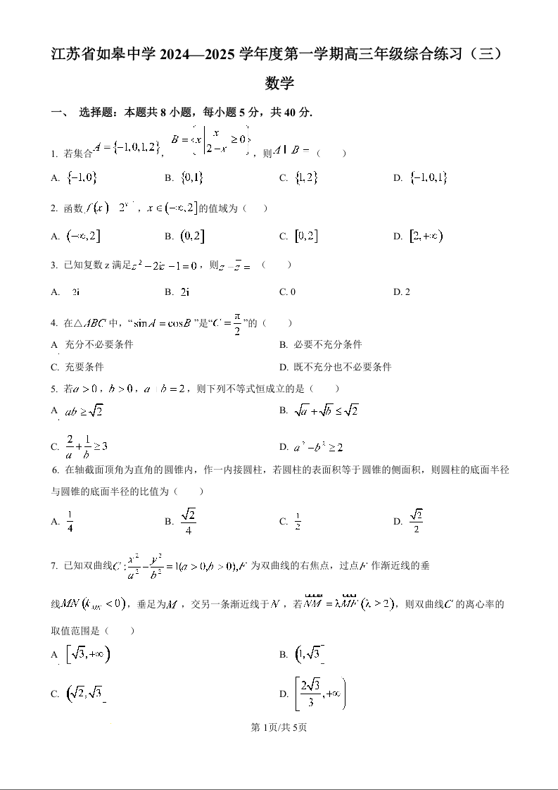 江苏省如皋中学20245届高三上学期综合练习(三)数学(原卷版)