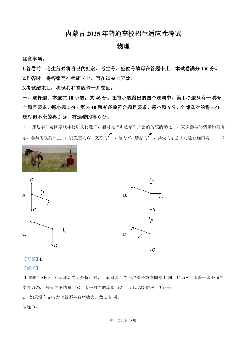 新八省联考2025年内蒙古高考综合改革适应性演练物理(精品解析版)