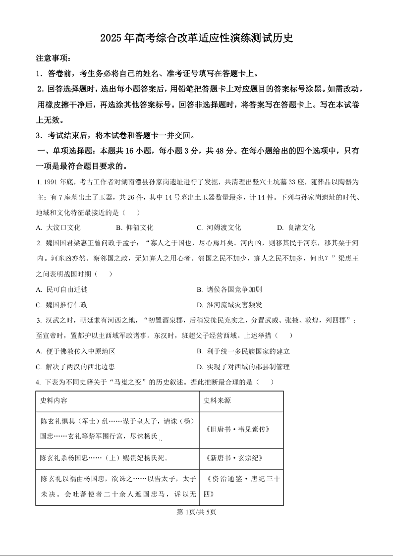 【四川卷】新八省联考2025年四川省高考综合改革适应性演练历史(原卷版)