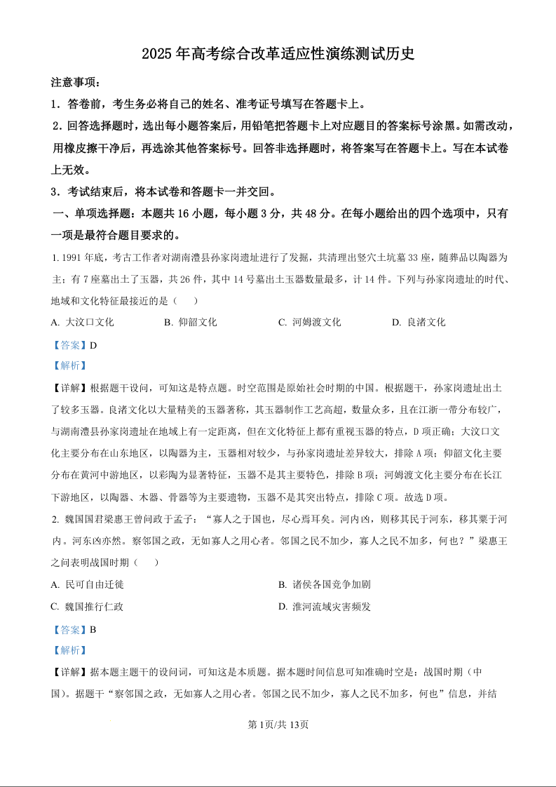 【四川卷】新八省联考2025年四川省高考综合改革适应性演练历史(精品解析版)