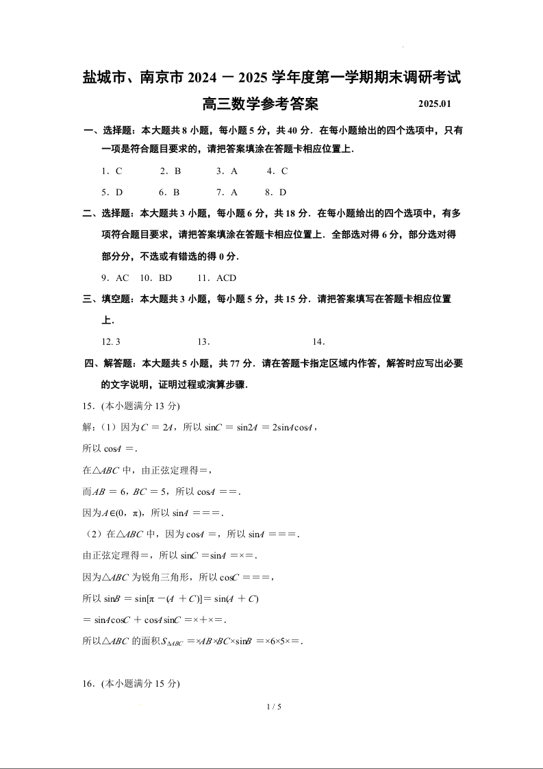 江苏省南京市、盐城市2025届高三年级第一次模拟考试数学答案