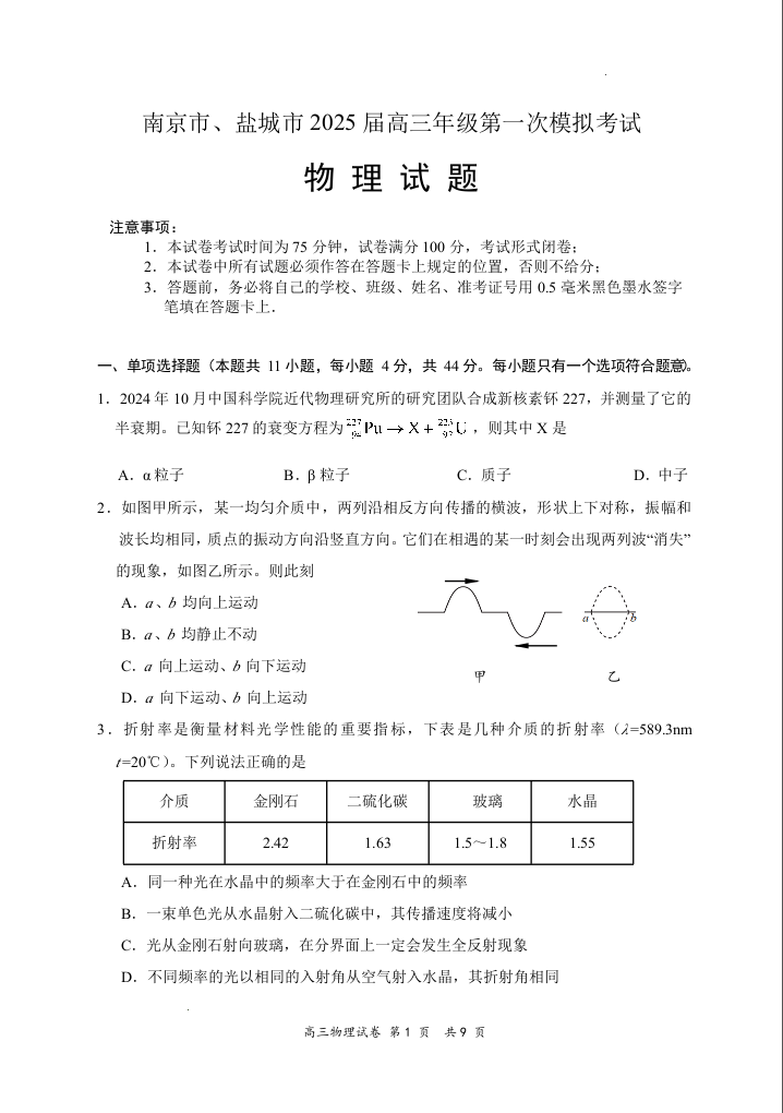江苏省南京市、盐城市2025届高三年级第一次模拟考试物理+答案