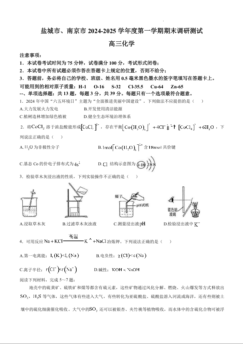 江苏省南京市、盐城市2025届高三年级第一次模拟考试化学