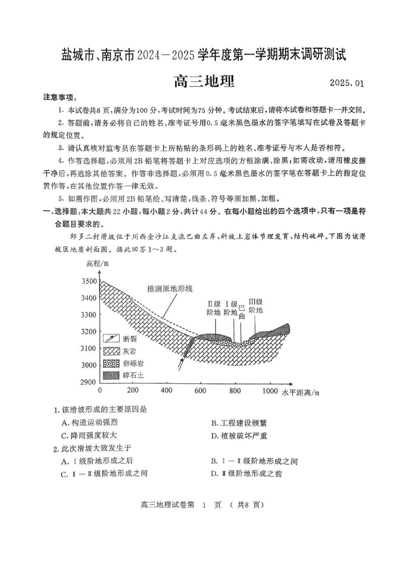 江苏省南京市、盐城市2025届高三年级第一次模拟考试地理