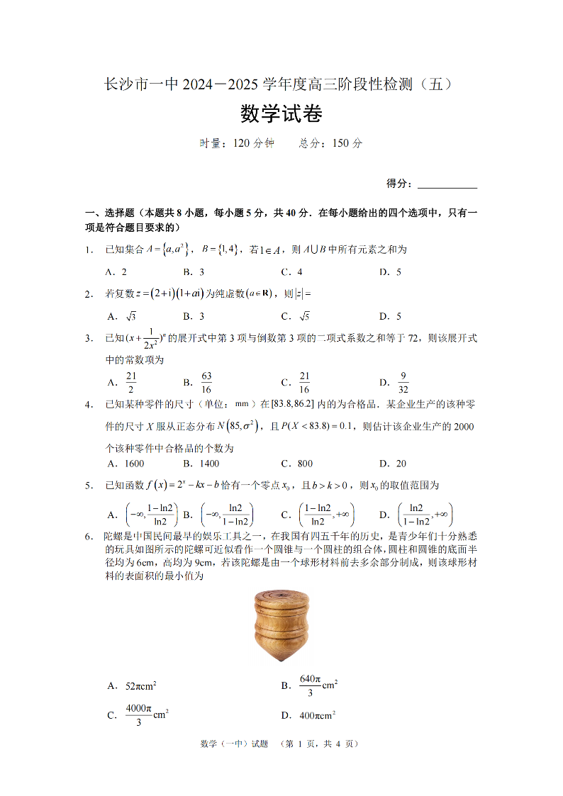 湖南省长沙市第一中学2025届高三上学期阶段性检测(五)数学