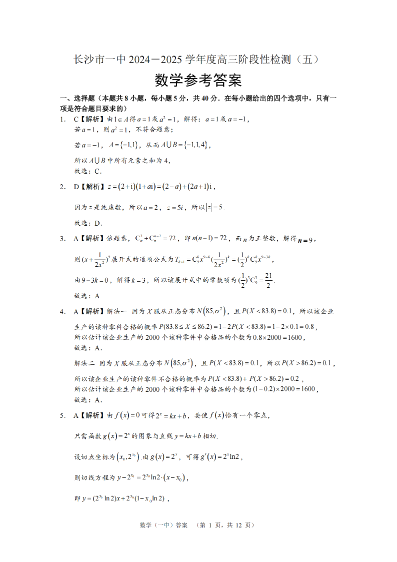 湖南省长沙市第一中学2025届高三上学期阶段性检测(五)数学答案