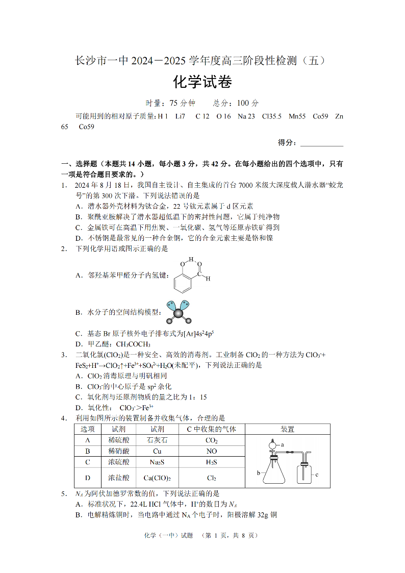 湖南省长沙市第一中学2025届高三上学期阶段性检测(五)化学