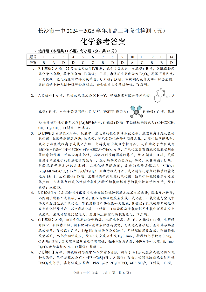湖南省长沙市第一中学2025届高三上学期阶段性检测(五)化学答案
