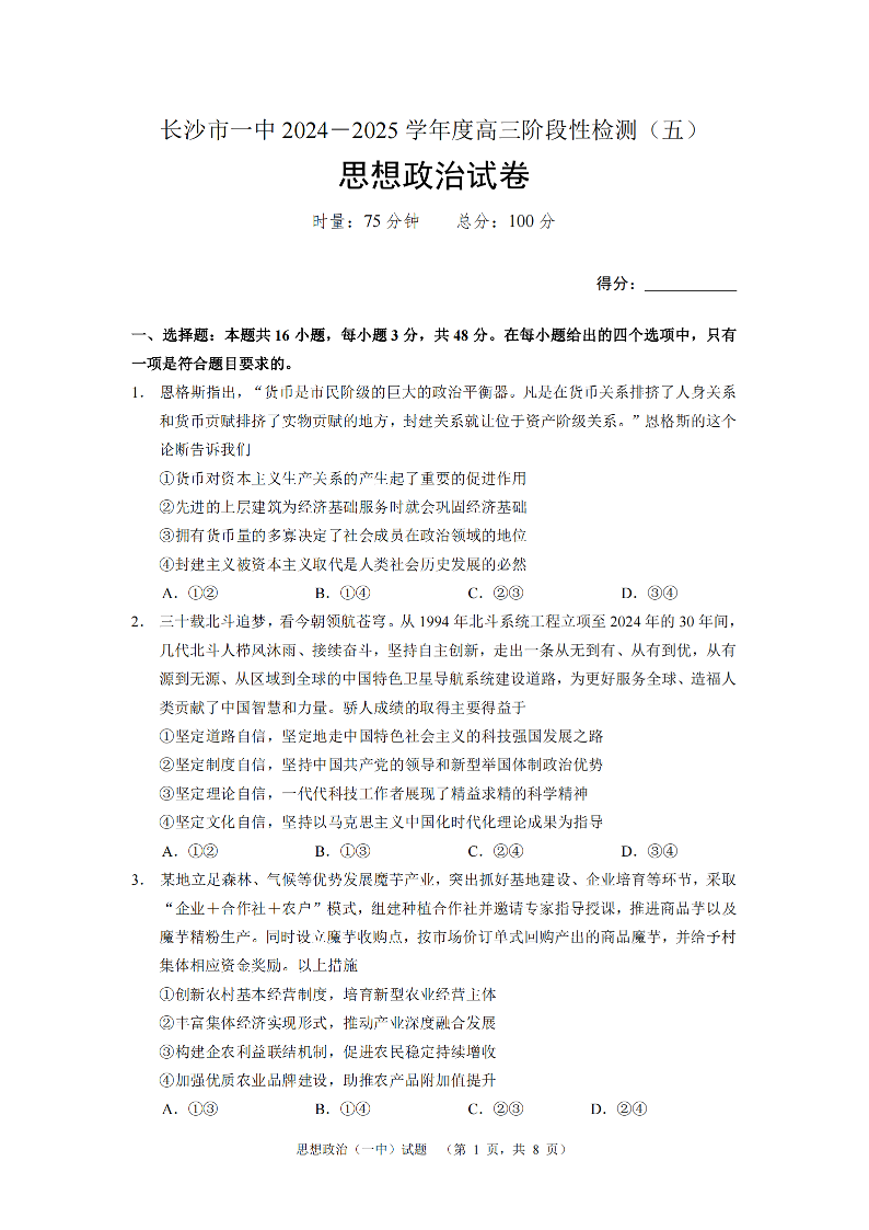 湖南省长沙市第一中学2025届高三上学期阶段性检测(五)政治