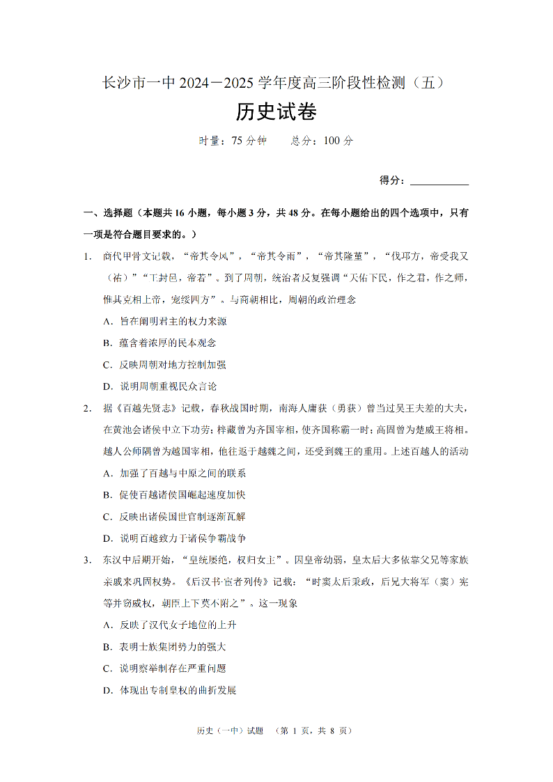 湖南省长沙市第一中学2025届高三上学期阶段性检测(五)历史