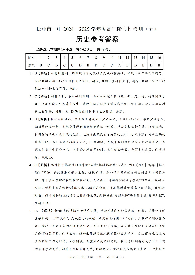 湖南省长沙市第一中学2025届高三上学期阶段性检测(五)历史答案