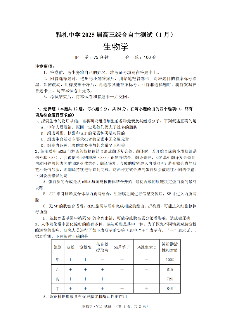 湖南省雅礼中学2025届高三上学期1月综合自主测试(期末)生物