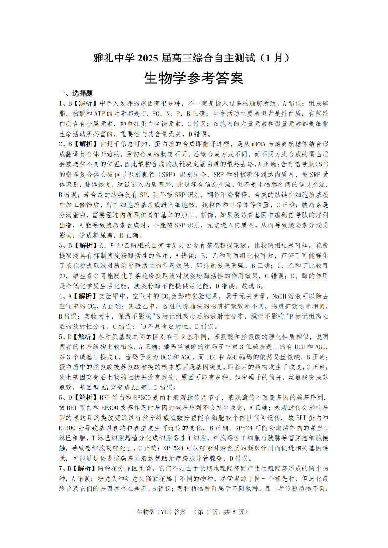 湖南省雅礼中学2025届高三上学期1月综合自主测试(期末)生物答案