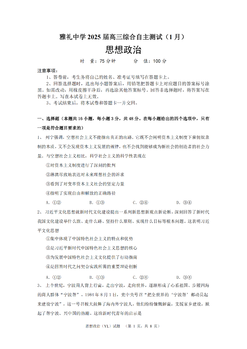 湖南省雅礼中学2025届高三上学期1月综合自主测试(期末)政治