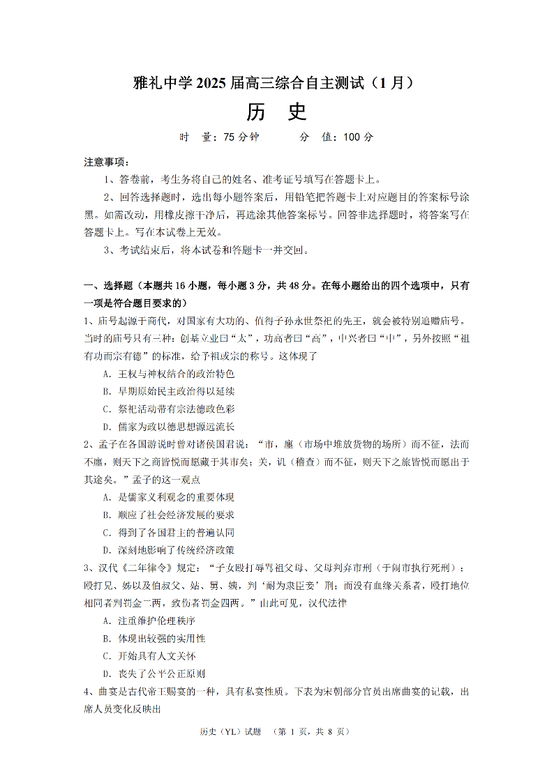 湖南省雅礼中学2025届高三上学期1月综合自主测试(期末)历史