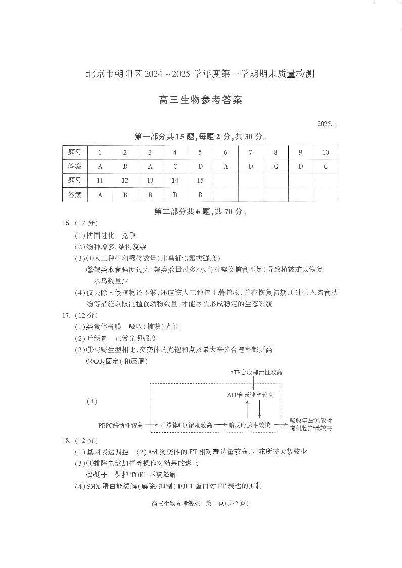 北京市朝阳区2025届高三上学期1月期末考试生物答案