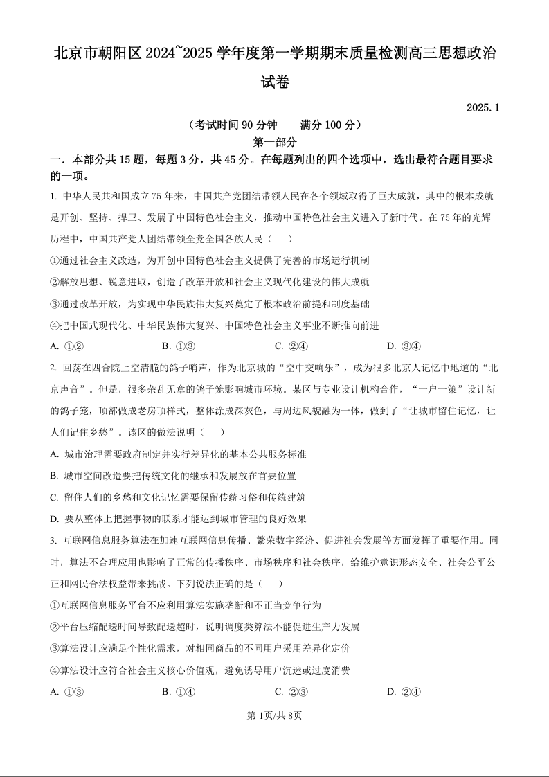 北京市朝阳区2025届高三上学期1月期末考试政治(原卷版)
