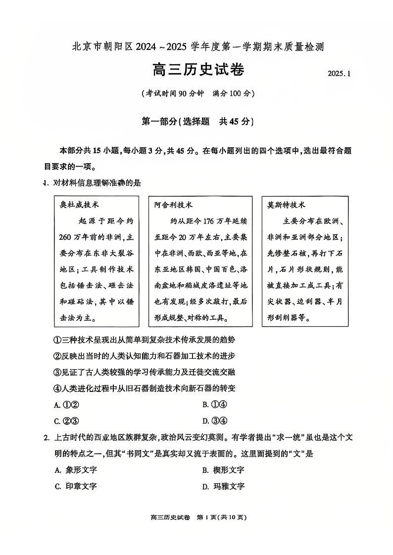 北京市朝阳区2025届高三上学期1月期末考试历史+答案