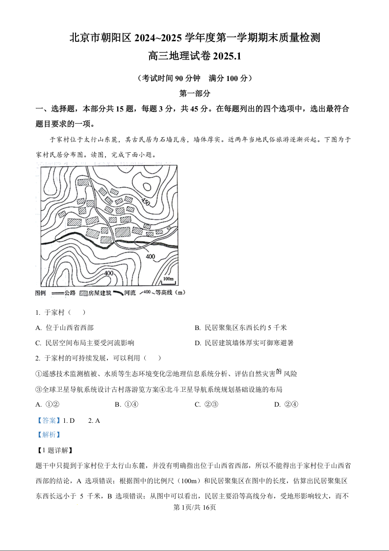 北京市朝阳区2025届高三上学期1月期末考试地理(精品解析版)