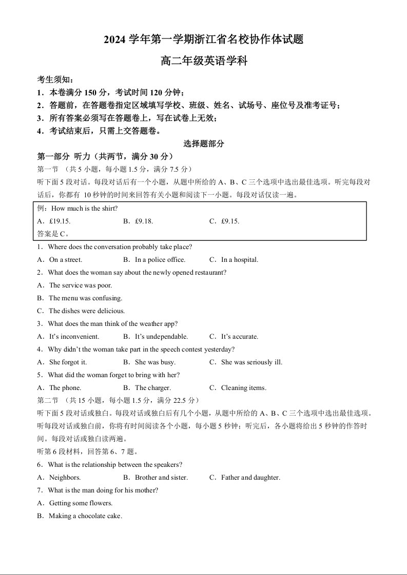 浙江省名校协作体2024-2025学年高二上学期开学考试英语+答案
