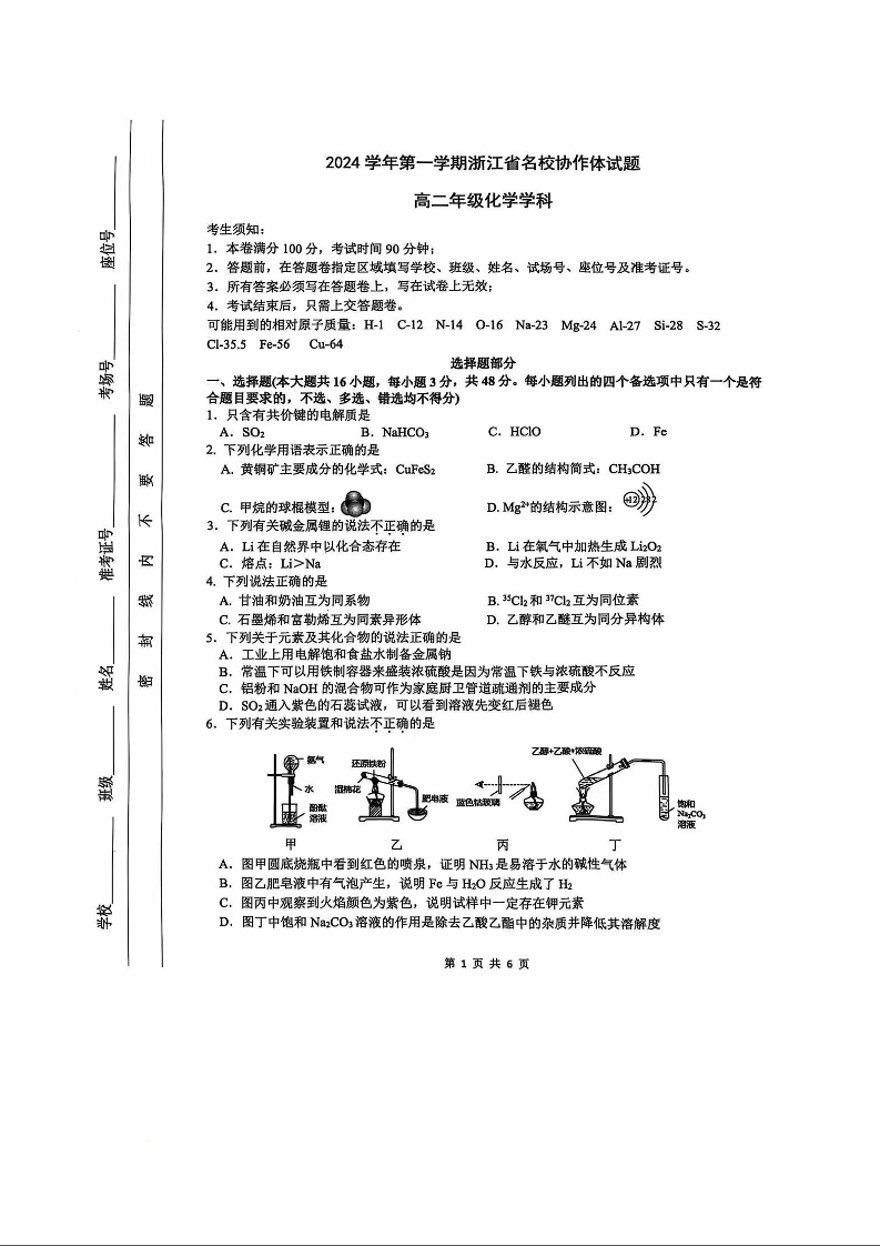 浙江省名校协作体2024-2025学年高二上学期开学考试化学
