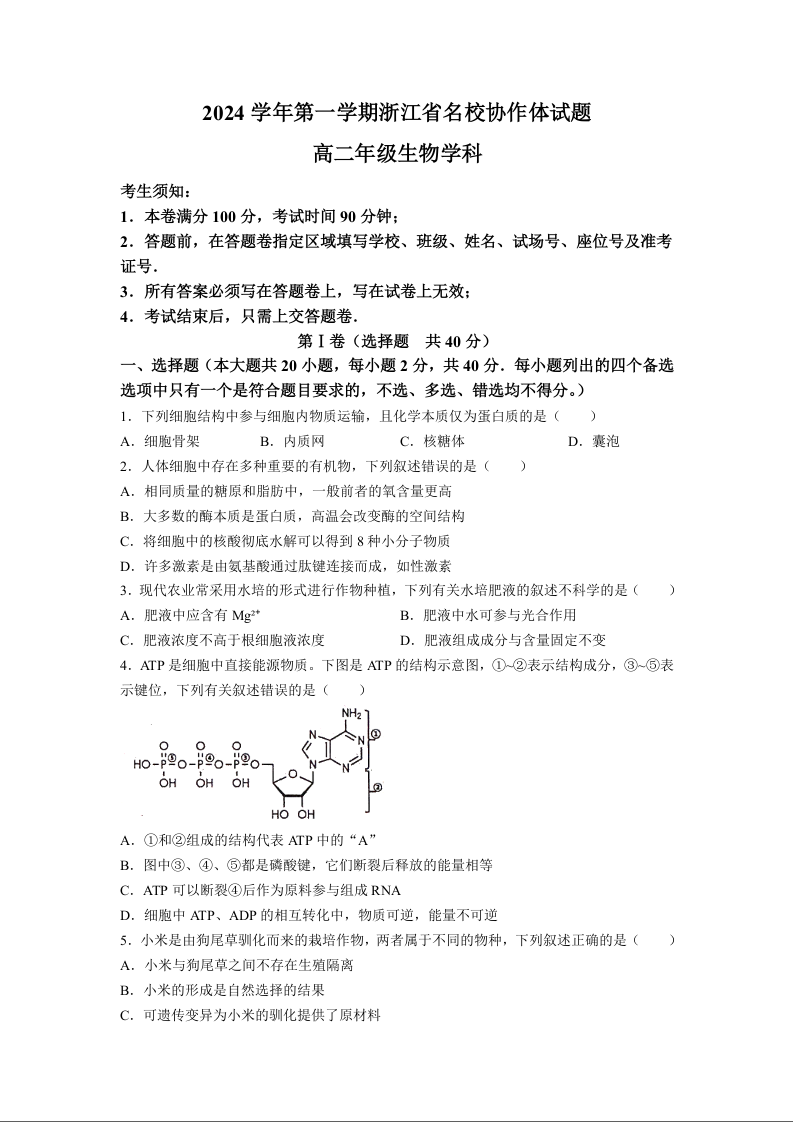 浙江省名校协作体2024-2025学年高二上学期开学考试生物