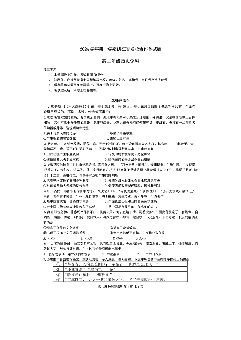 浙江省名校协作体2024-2025学年高二上学期开学考试历史+答案