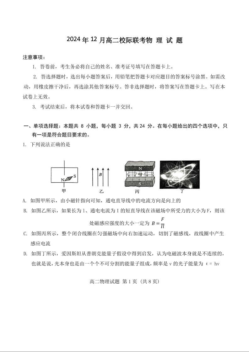 山东省济宁市校际联考2024-2025学年高二上学期12月月考物理+答案