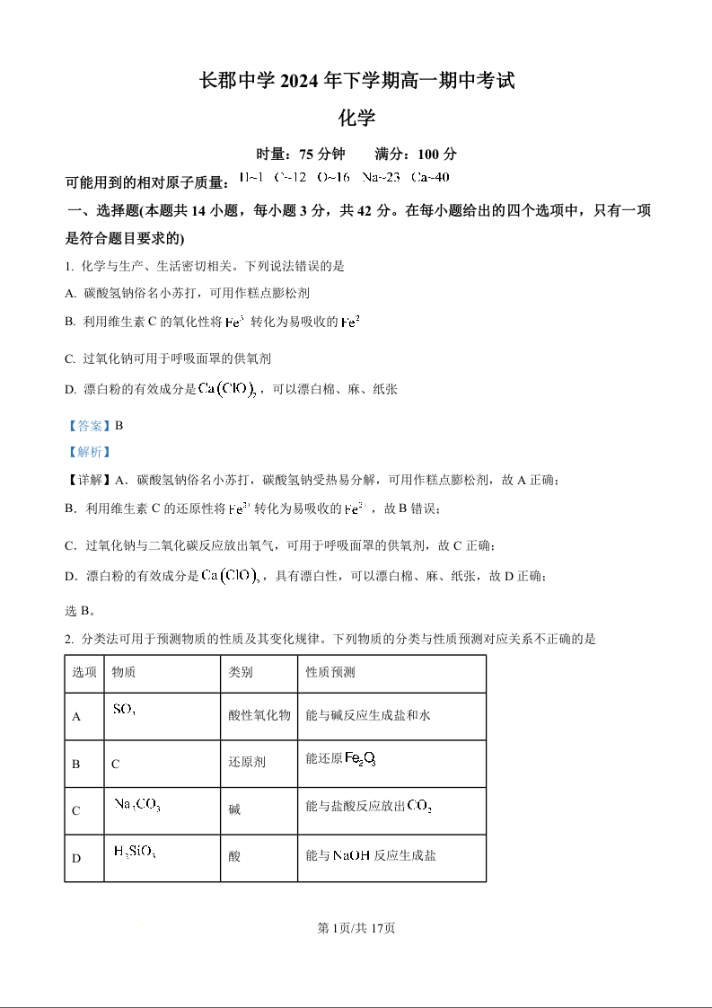 湖南省长沙市长郡中学2024年下学期高一期中考试化学试题(解析版)
