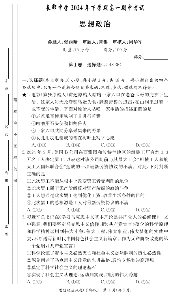 湖南省长沙市长郡中学2024年下学期高一期中考试政治