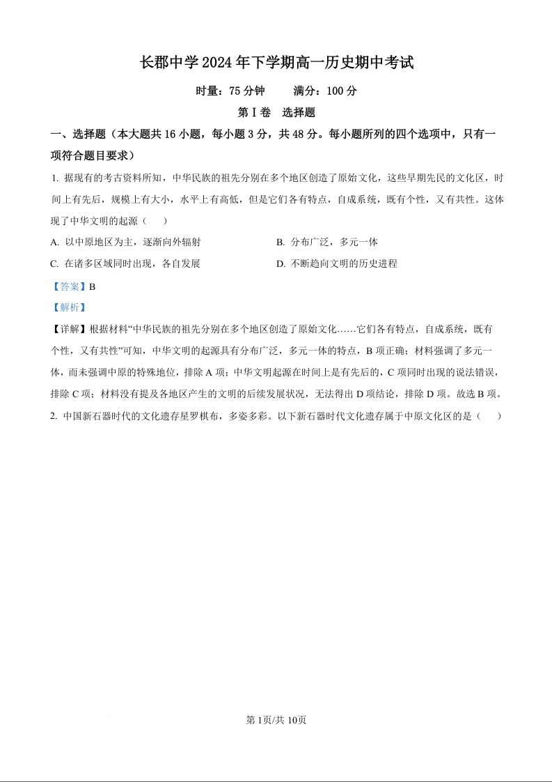 湖南省长沙市长郡中学2024年下学期高一期中考试历史试题(解析版)