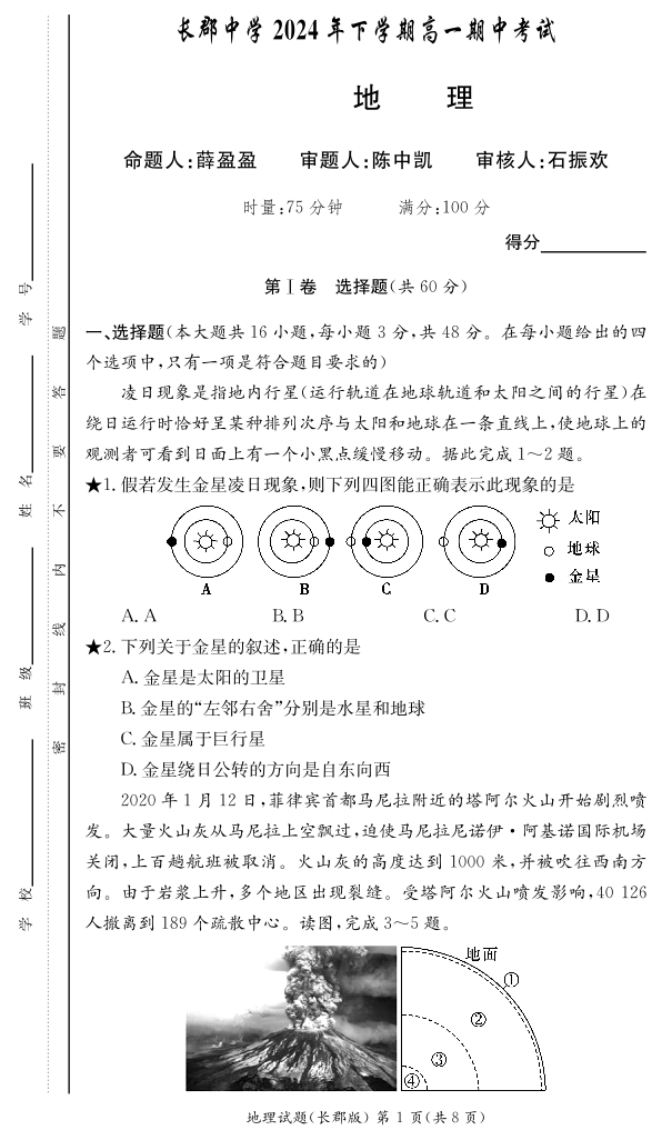 湖南省长沙市长郡中学2024年下学期高一期中考试地理