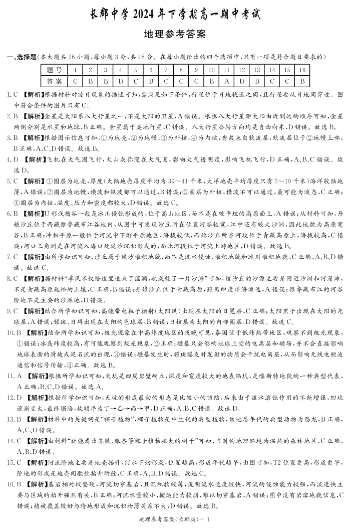 湖南省长沙市长郡中学2024年下学期高一期中考试地理答案