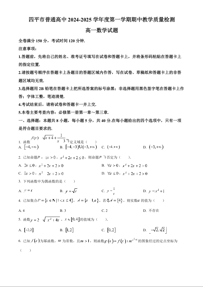 吉林省四平市普通高中2024-2025学年度第一学期期中教学质量检测数学(原卷版)