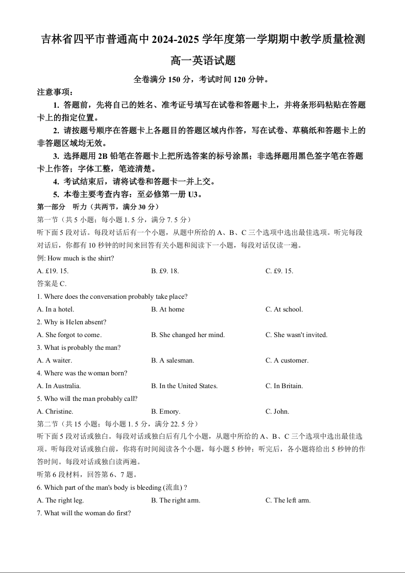 吉林省四平市普通高中2024-2025学年高一上学期期中教学质量检测试题 英语+答案