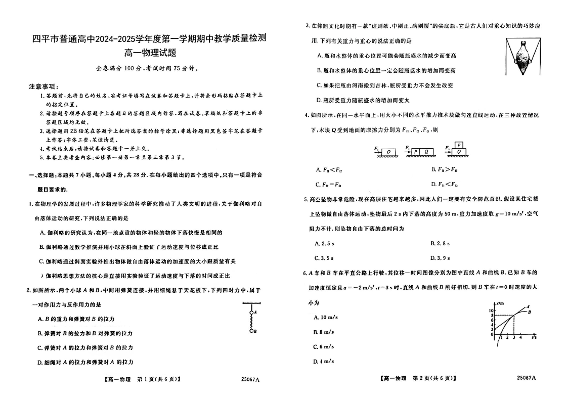 吉林省四平市普通高中2024-2025学年度第一学期期中教学质量检测物理