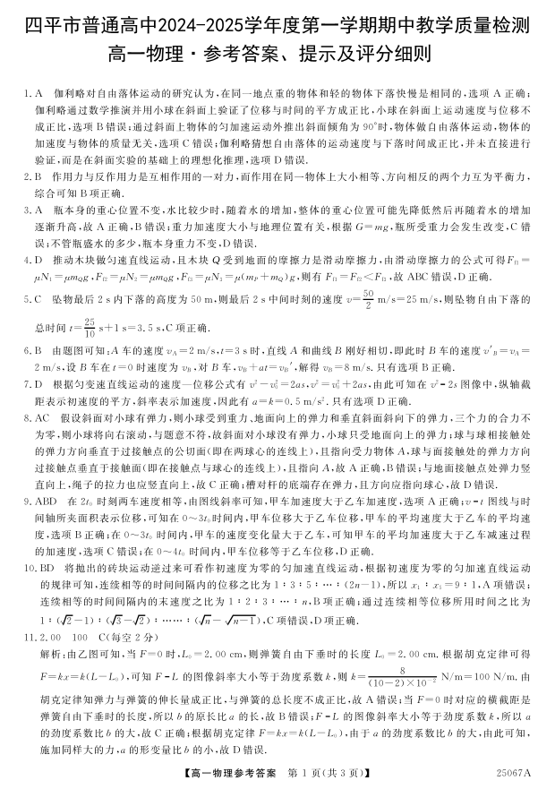 吉林省四平市普通高中2024-2025学年度第一学期期中教学质量检测物理答案