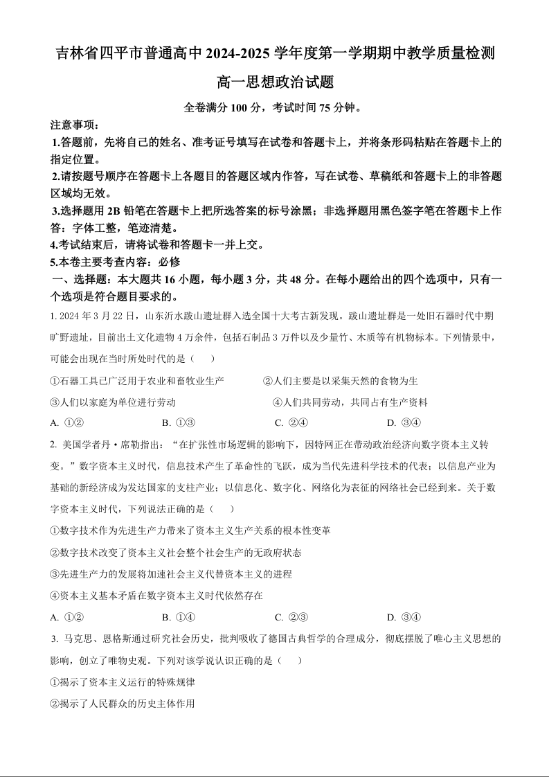 吉林省四平市普通高中2024-2025学年度第一学期期中教学质量检测政治(原卷版)