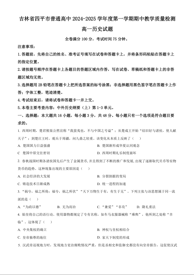 吉林省四平市普通高中2024-2025学年度第一学期期中教学质量检测历史(原卷版)
