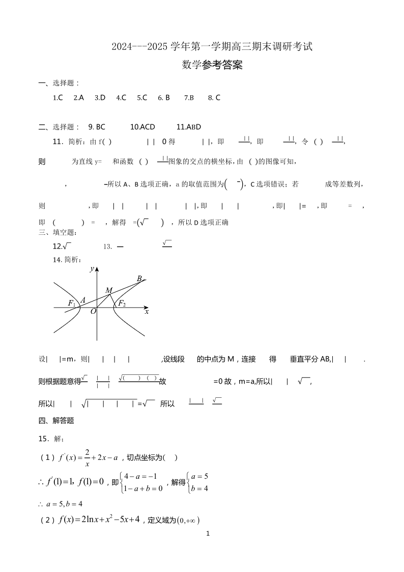 河北省保定市高中2025高三上学期1月调研考试数学答案