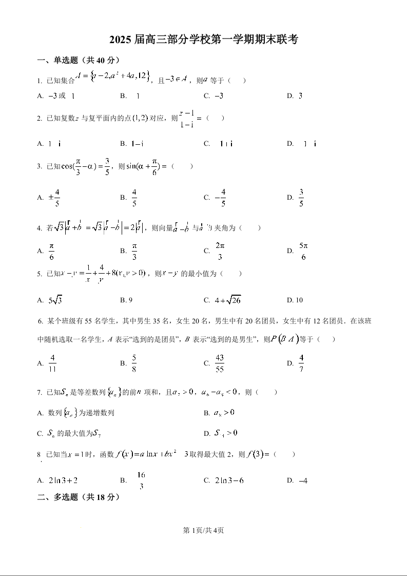 浙江省杭州市部分学校2025届高三上学期期末联考数学(原卷版)
