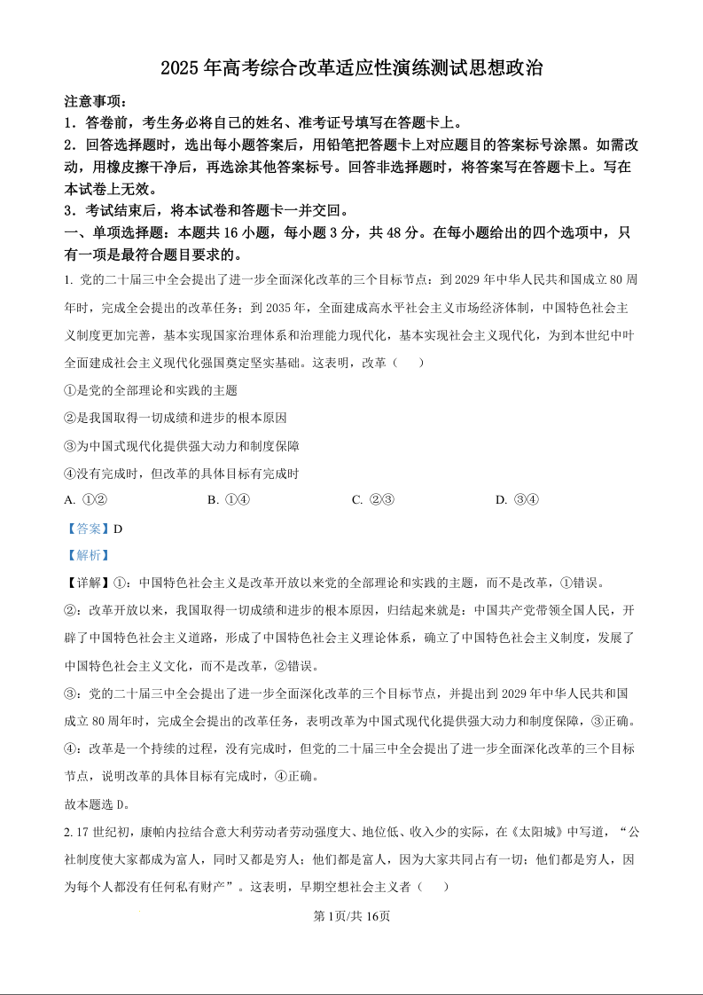 【四川卷】新八省联考2025年内蒙古高考综合改革适应性演练政治(精品解析版)