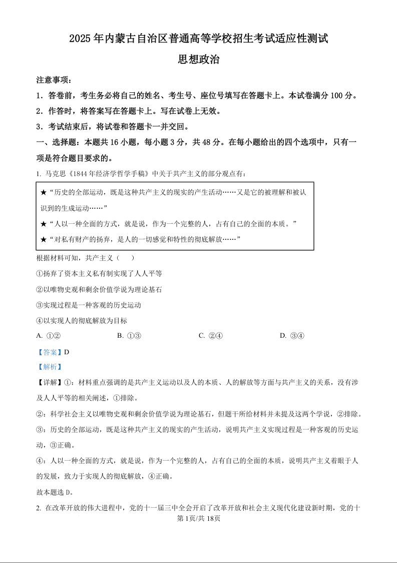 【内蒙古卷】新八省联考2025年内蒙古高考综合改革适应性演练政治(精品解析版)