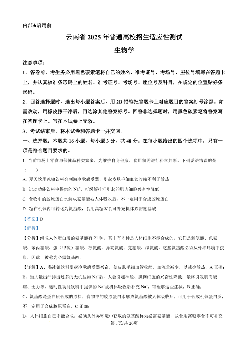 【云南卷】新八省联考2025年内蒙古高考综合改革适应性演练生物(精品解析版)