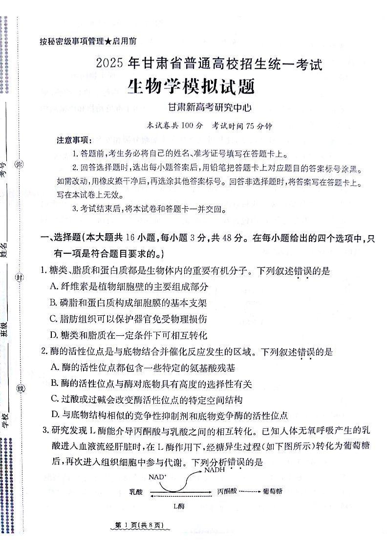甘肃省白银市部分学校2025届高三上学期1月期末考试生物