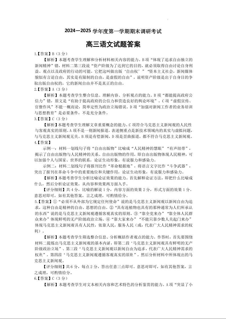 河北省保定市2025届第一学期1月期末高三调研考试语文答案