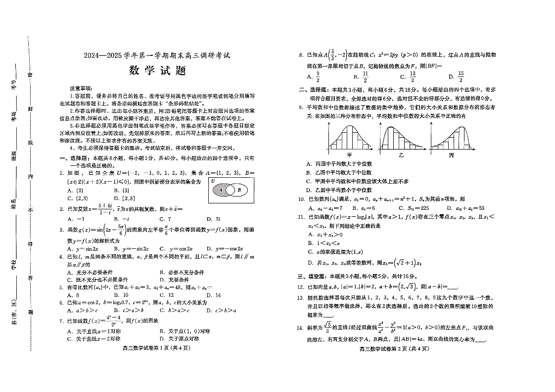 河北省保定市2025届第一学期1月期末高三调研考试数学